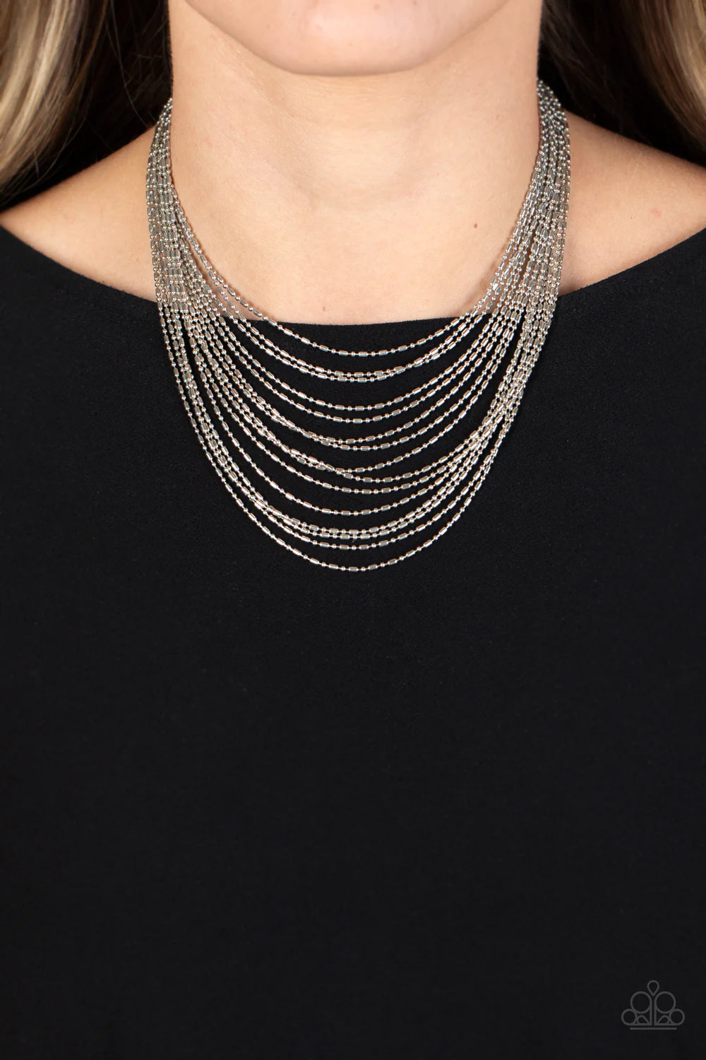 Suspended from two silver, horizontal bars, a shimmery cascade of high-sheen silver ball-and-bar chains layer around the neck for an industrial statement. Features an adjustable clasp closure.
