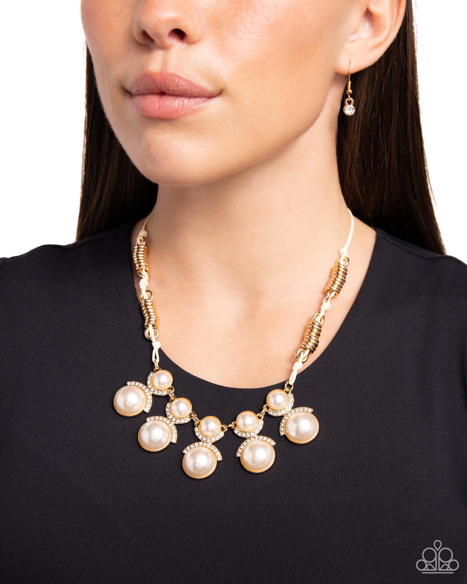 Connected to an ivory cord, a collection of glossy white pearls, bordered by white rhinestone-encrusted gold curls and pressed in gold frames, gives way to oversized white pearls in the same fittings. Glistening gold coils sporadically connect along the ivory cording for additional refinement. Features an adjustable clasp closure.