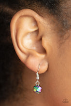 Separated by silver discs and faceted silver accents, faceted oil spill crystal-like gems are threaded along an invisible wire below the collar for a stellar statement. Due to its prismatic palette, color may vary. Features an adjustable clasp closure.