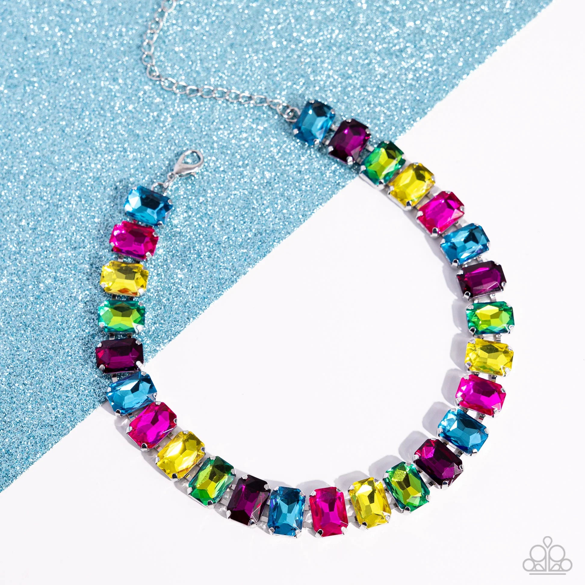 Set in pronged silver fittings, multicolored emerald-cut gems encircle the collar for an optimistically opulent display. Features an adjustable clasp closure.