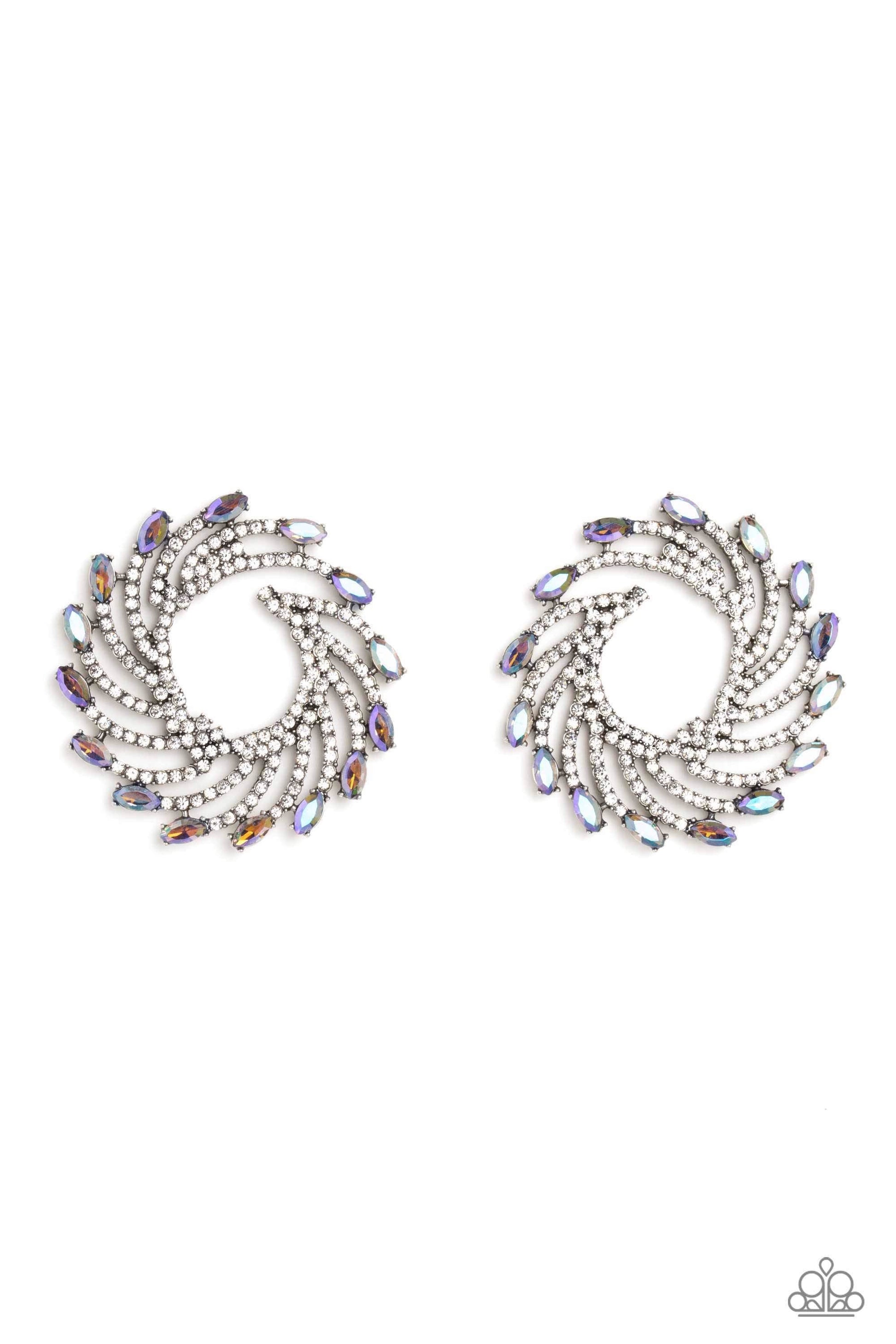 Shimmery strands of silver spin out from an airy center, creating an exaggerated firework-like display at the ear. An explosion of dainty white rhinestones lines the swirls and curves of the shimmery display leading the eye to the collection of colorfully reflective marquise-cut gems at its ends. Each colorfully reflective marquise-cut gem curls around the ear in a clock-like manner, creating additional eye-catching dimension. Earring attaches to a standard post fitting. Due to its prismatic palette, color may vary.