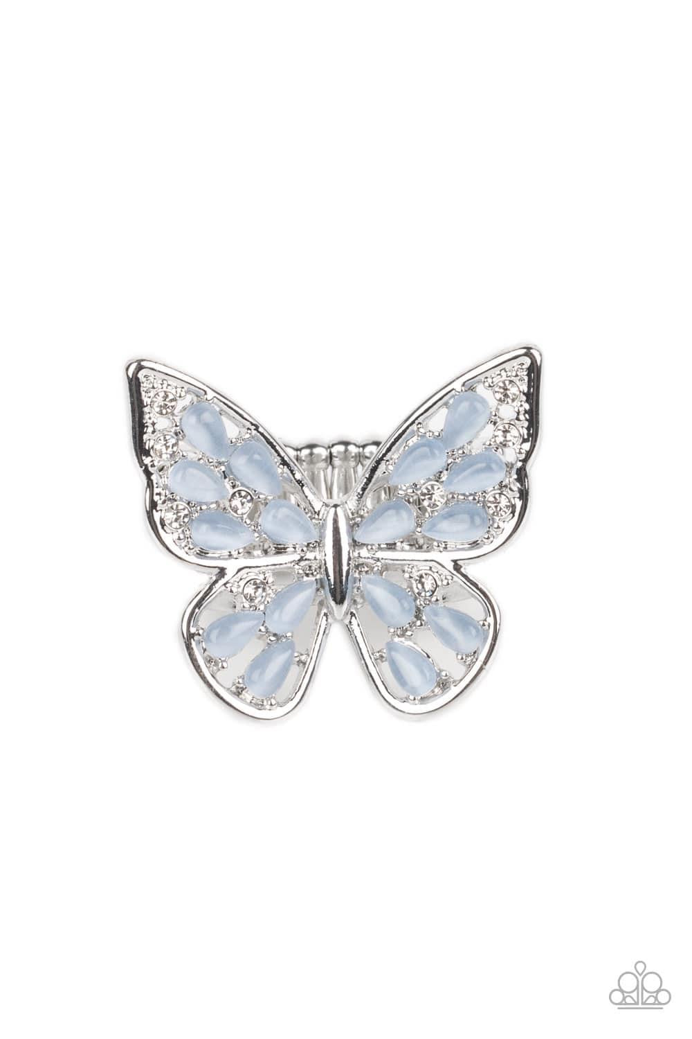 Shiny silver bars curl into the shape of a butterfly, creating a whimsical centerpiece that flutters atop the finger. Blue opalescent beads fill the inside of the wings, leaving spaces in between for the design to remain airy and light. Finally, tiny white rhinestones line the inside edges of the silver frame, adding a hint of irresistible sparkle to the mix. Features a stretchy band for a flexible fit.