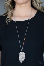 One side of a lengthened silver chain is dotted in dainty orange crystal-like beads as it gives way to an oversized leaf pendant embossed in lifelike textures for a seasonal finish. Features an adjustable clasp closure.