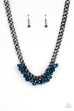 A faceted collection of metallic flecked blue beads cluster along the center of a chunky gunmetal curb chain, creating a stellar fringe below the collar. Features an adjustable clasp closure.