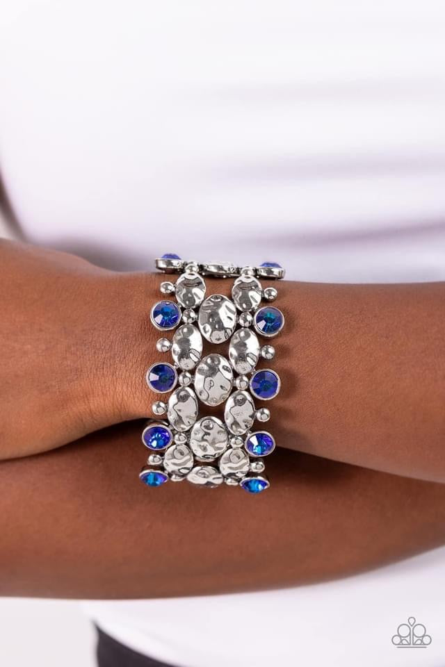 A collection of hammered oval silver beads, sleek silver beads, and blue UV beads are threaded along stretchy bands around the wrist, creating a zigzag pattern of edge. Due to its prismatic palette, color may vary.