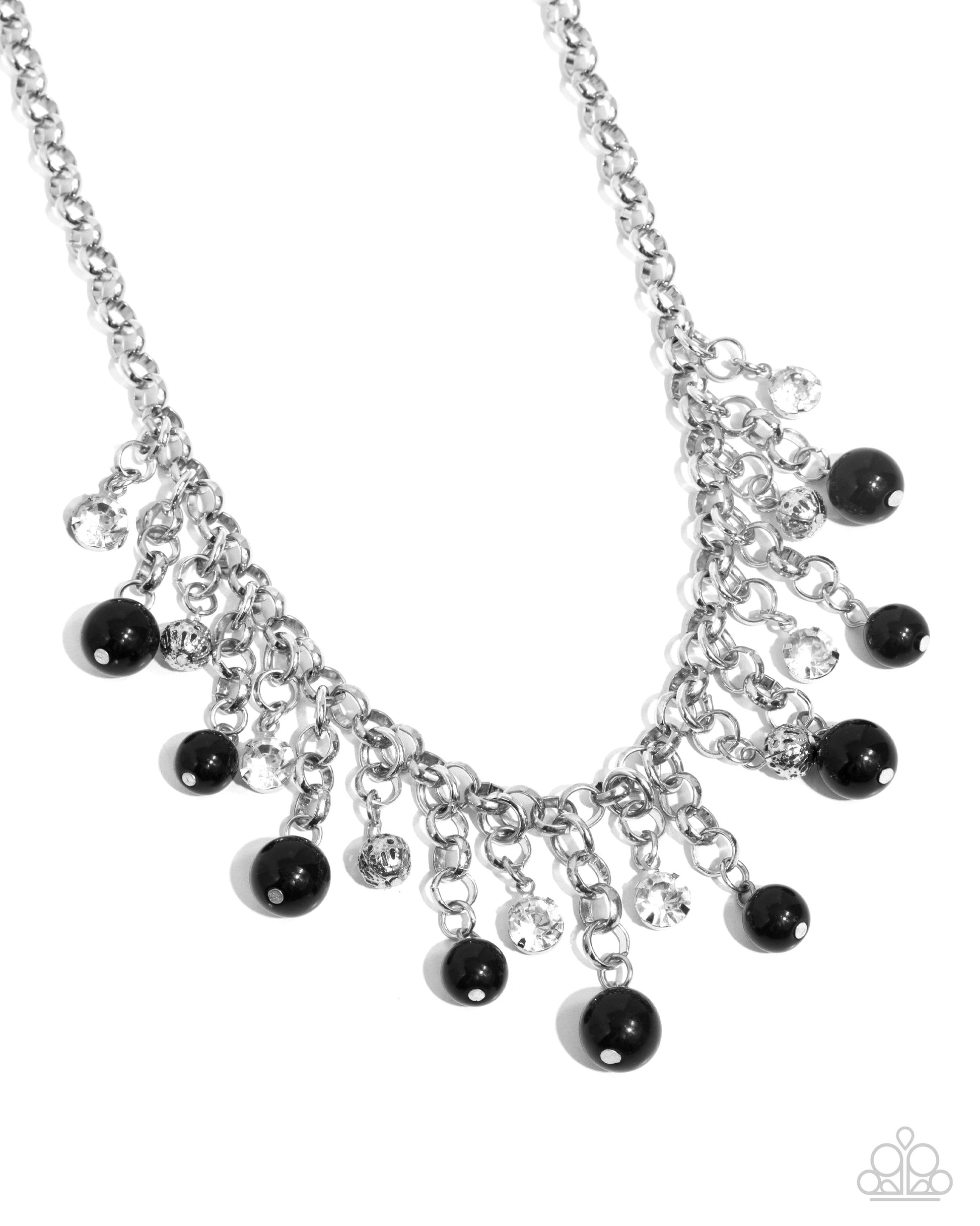 A collection of bubbly black beads, glittery white rhinestones, and ornate silver beads swing from the bottom of a shimmery silver chain, creating a refined fringe below the collar. Features an adjustable clasp closure.