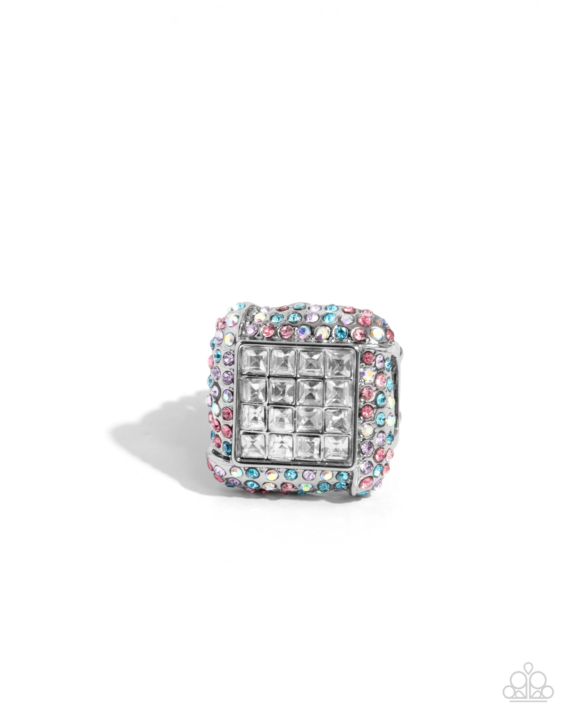 Featuring a collection of faceted white square-cut gems, a thick silver frame embellished with multicolored and iridescent rhinestones glistens atop the finger for a standout, sparkly centerpiece. Features a stretchy band for a flexible fit. Due to its prismatic palette, color may vary.