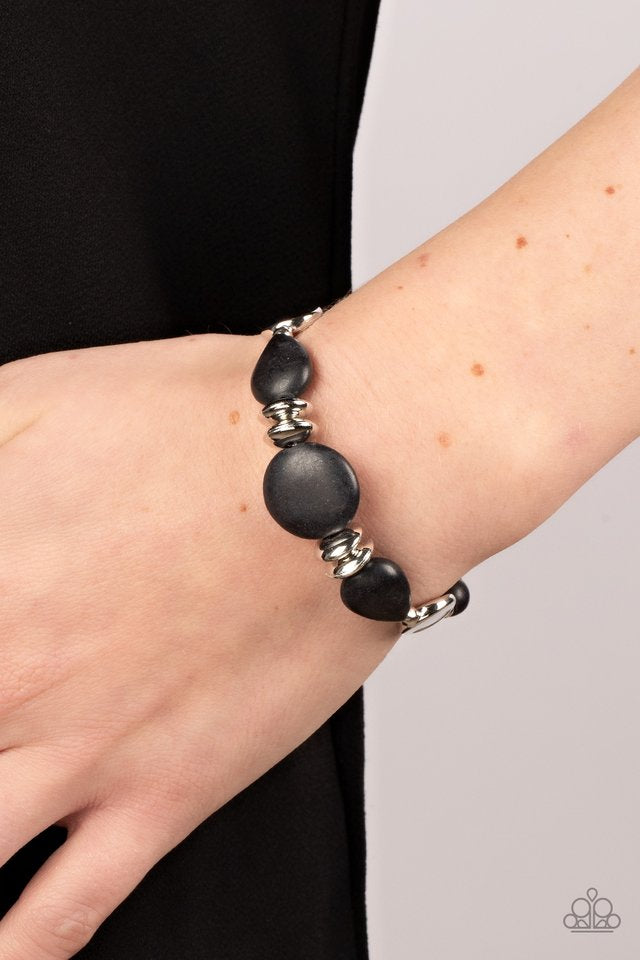 Round and teardrop black stone beads join mismatched silver accents along an invisible wire around the wrist, resulting in an artisan inspired fashion. Features an adjustable clasp closure.