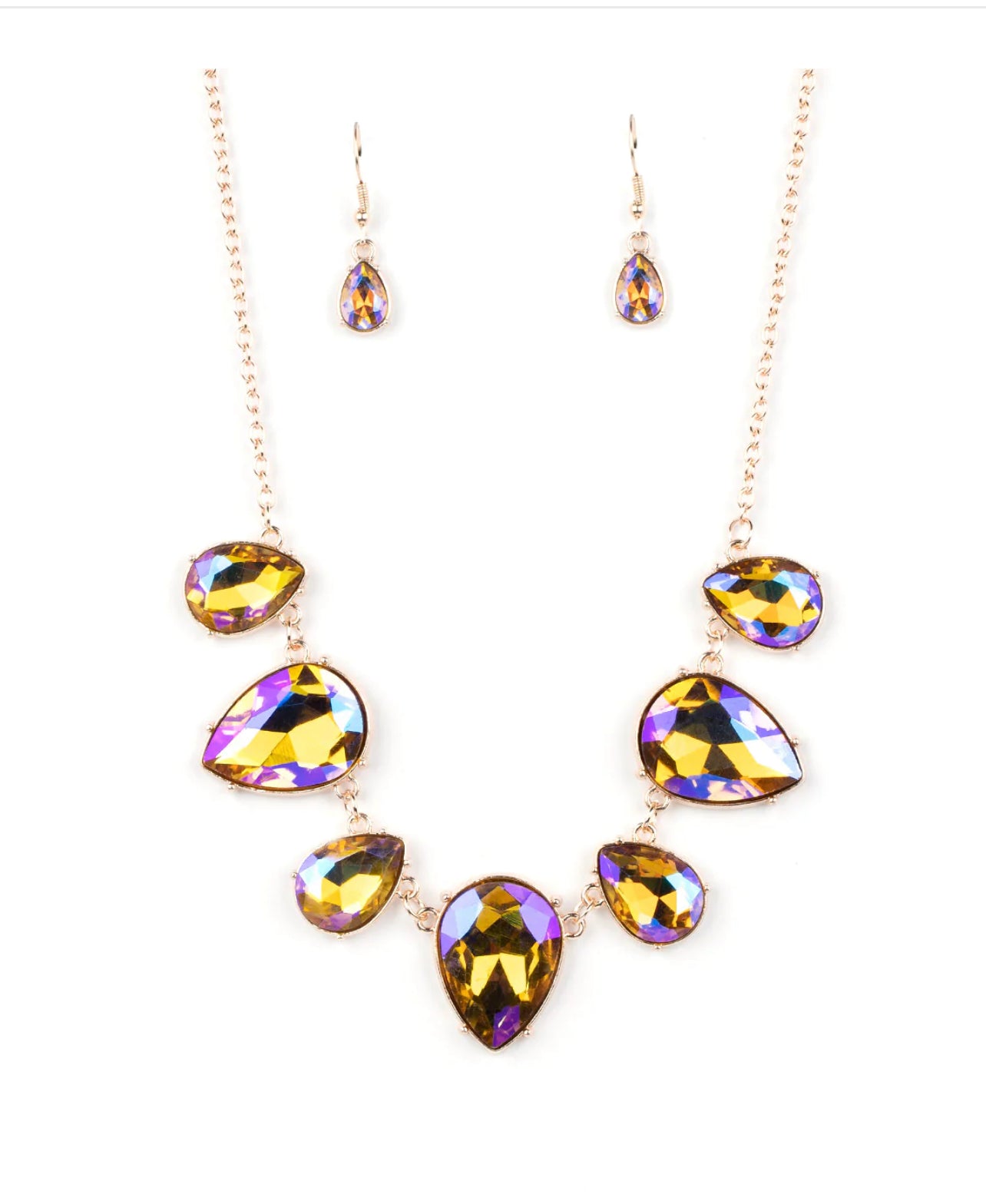 Featuring a stellar iridescence, an oversized collection of glittery iridescent teardrop gems alternates upside down and right-side-up below the collar for an out-of-this-world sparkle. Features an adjustable clasp closure. Due to its prismatic palette, color may vary.