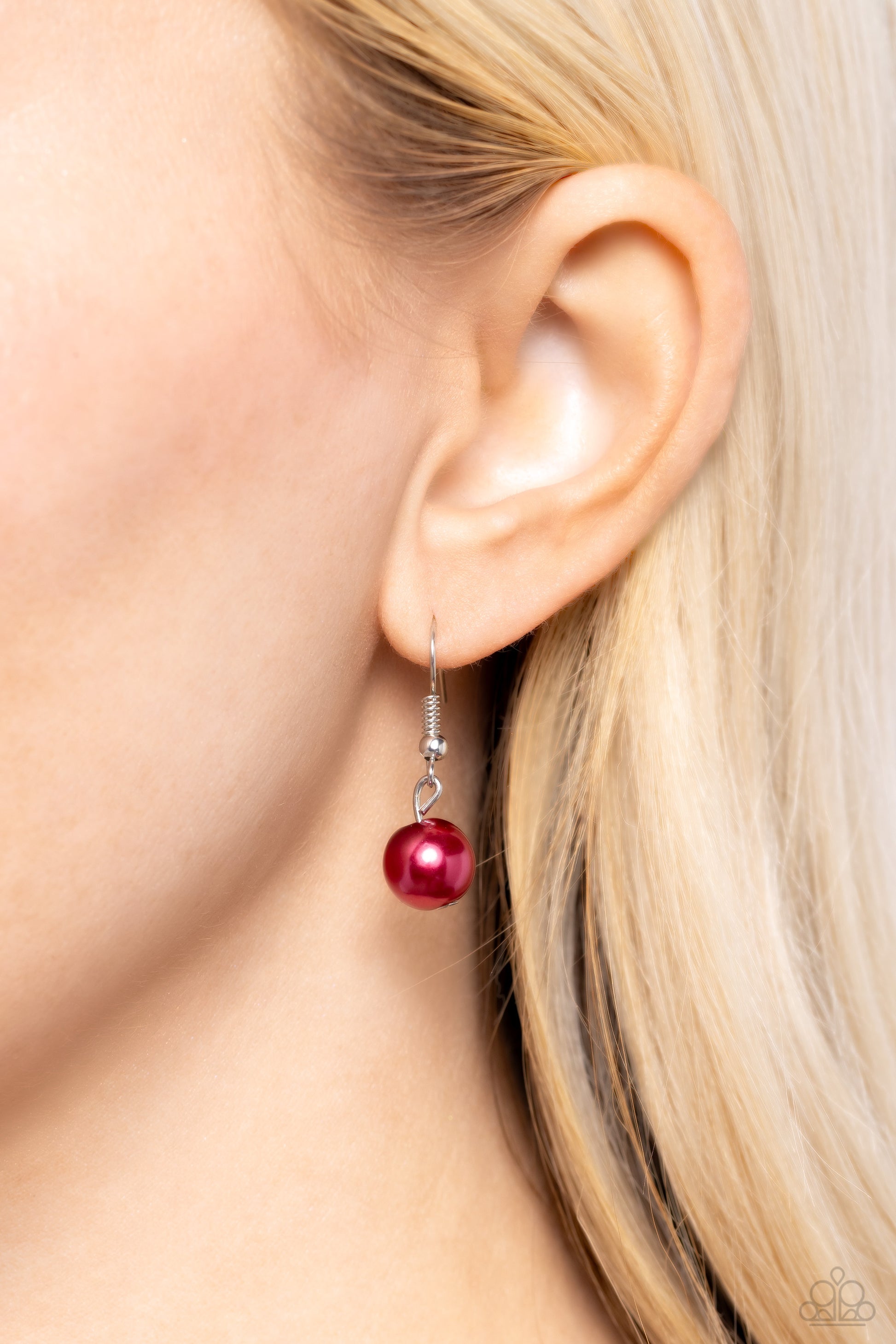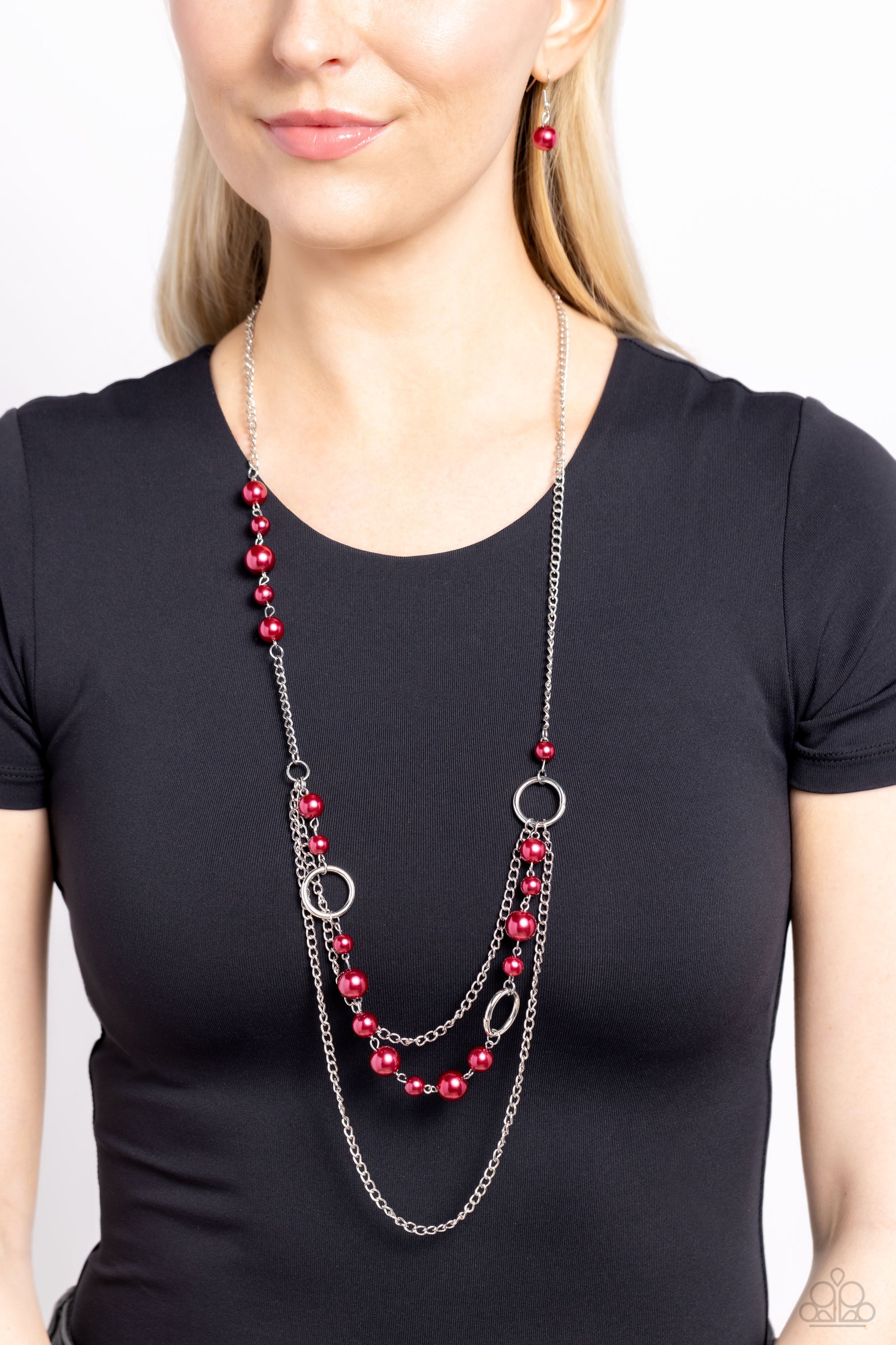 Pearly red beads and shimmery silver hoops trickle along glistening silver chains, creating mismatched layers down the chest. Features an adjustable clasp closure.