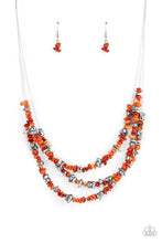 An earthy collection of raw cut silver and orange pebbles are threaded along dainty wires below the collar, creating refreshing layers. Features an adjustable clasp closure.