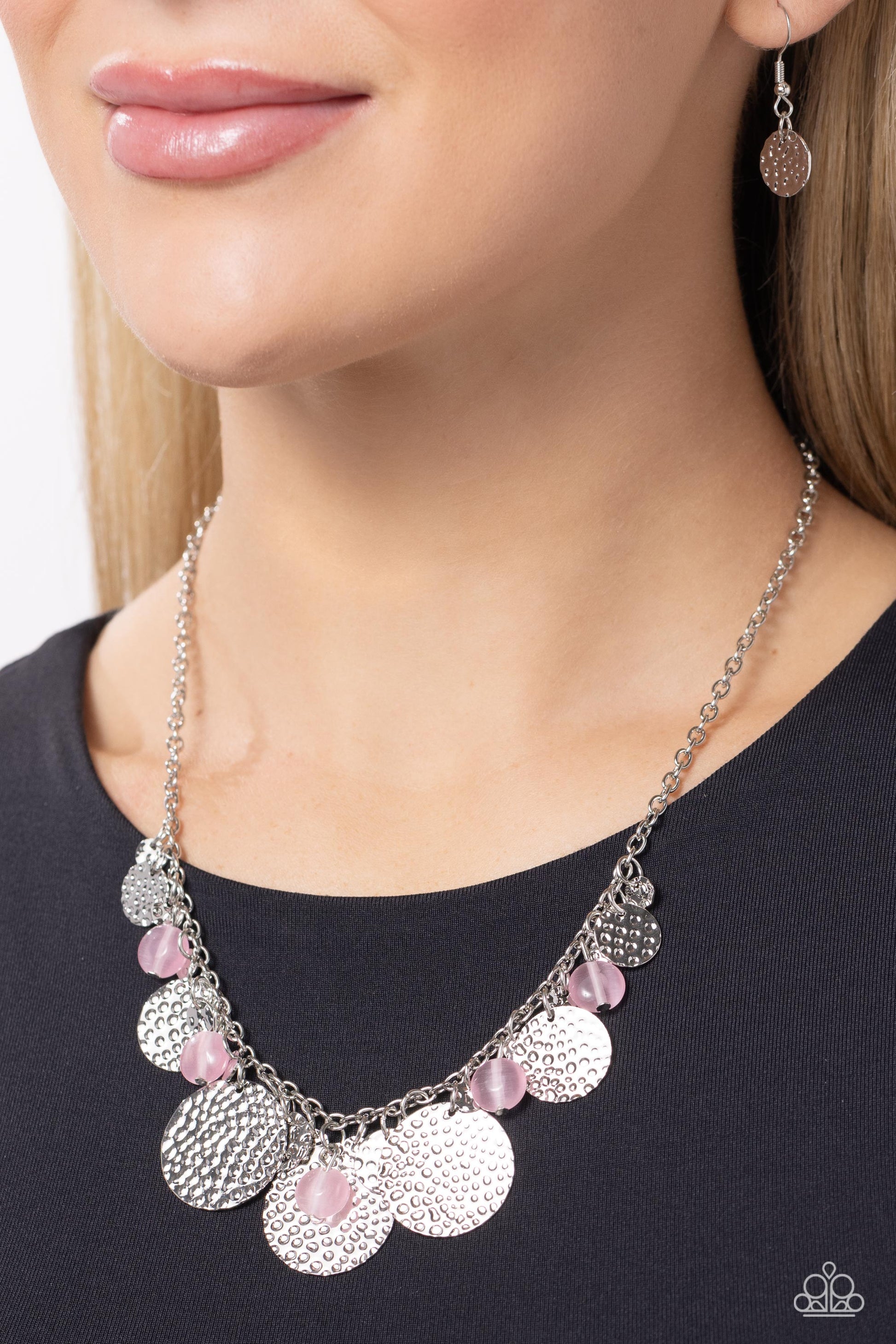 Cascading from a classic silver chain, a collection of various-sized hammered silver discs and baby pink cat's eye beads twinkle below the neckline for a radiant display. Features an adjustable clasp closure.