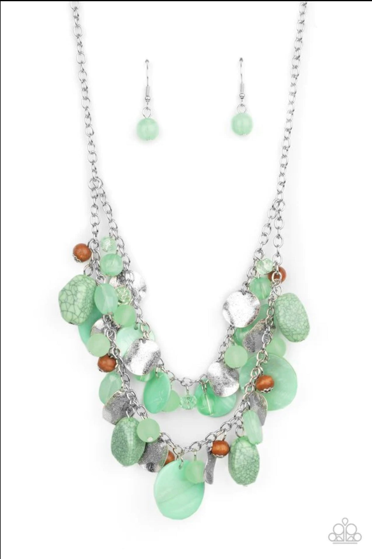 Infused with wooden beads and silver discs, an earthy collection of glassy, opaque, and shell-like green beads swing from two silver chains. The vivacious display effortlessly layers below the collar, creating a springtime inspired fringe. Features an adjustable clasp closure.