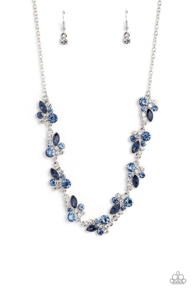 An eclectic collection of white and blue round rhinestones in varying sizes and marquise-cut gems in a blue shade cluster around the collar in high-sheen silver frames. Patterned in an abstract manner, the clusters interlock together, emitting light from every faceted angle. Features an adjustable clasp closure.