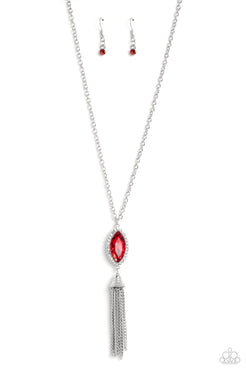 An oversized, glitzy, marquise-cut red gem, pressed in a white, gem-studded frame cascades from a classic silver chain for a sparkly statement. Featured below the bright red gem, silver chains stream from a studded fitting, creating a stunning tassel for additional eye-catching sheen and movement. Features an adjustable clasp closure.
