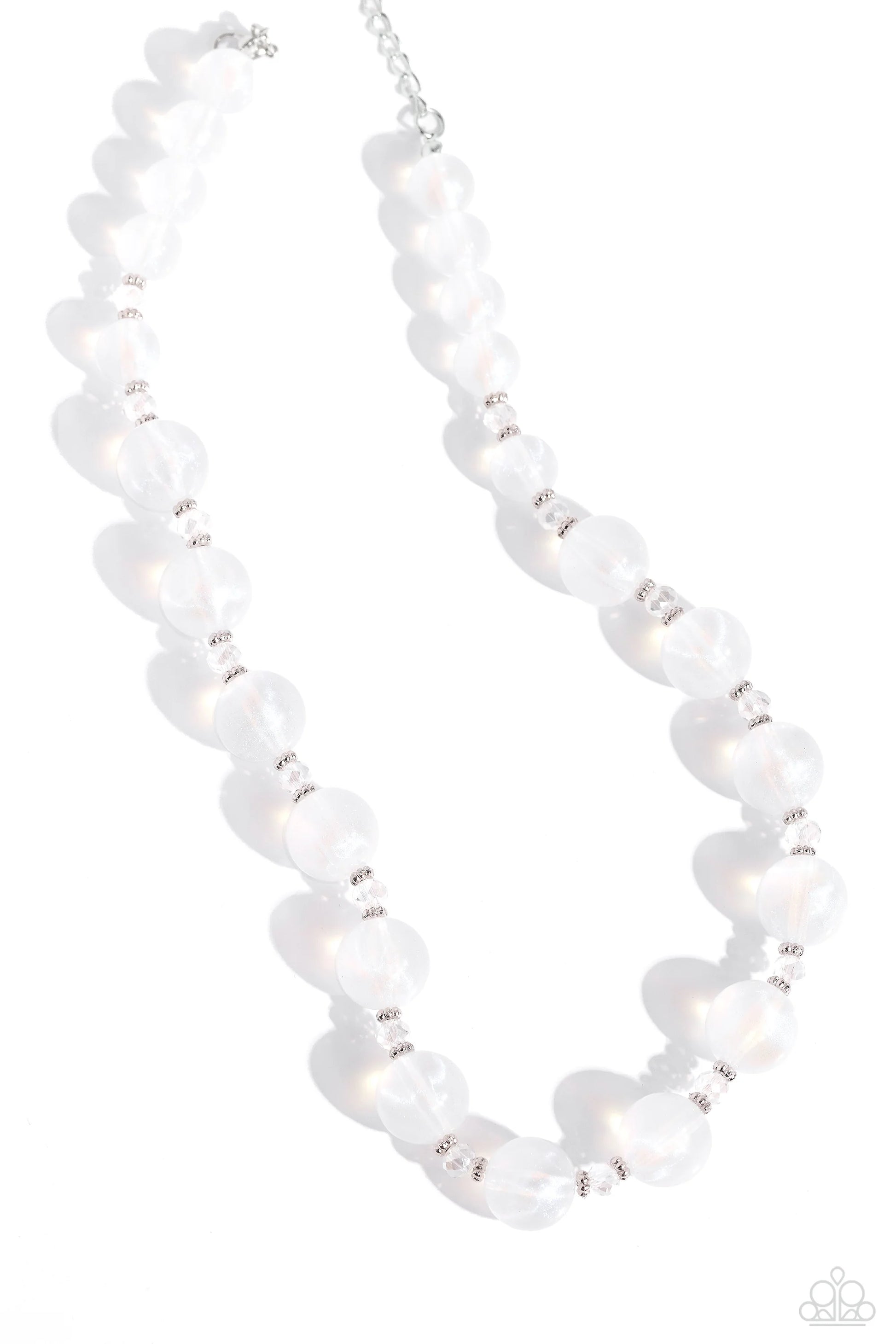Infused with dainty silver accents and faceted clear beads, a collection of white opalescent beads, brushed in an iridescent shimmer are threaded along an invisible wire below the collar for a timeless look. Features an adjustable clasp closure. Due to its prismatic palette, color may vary.
