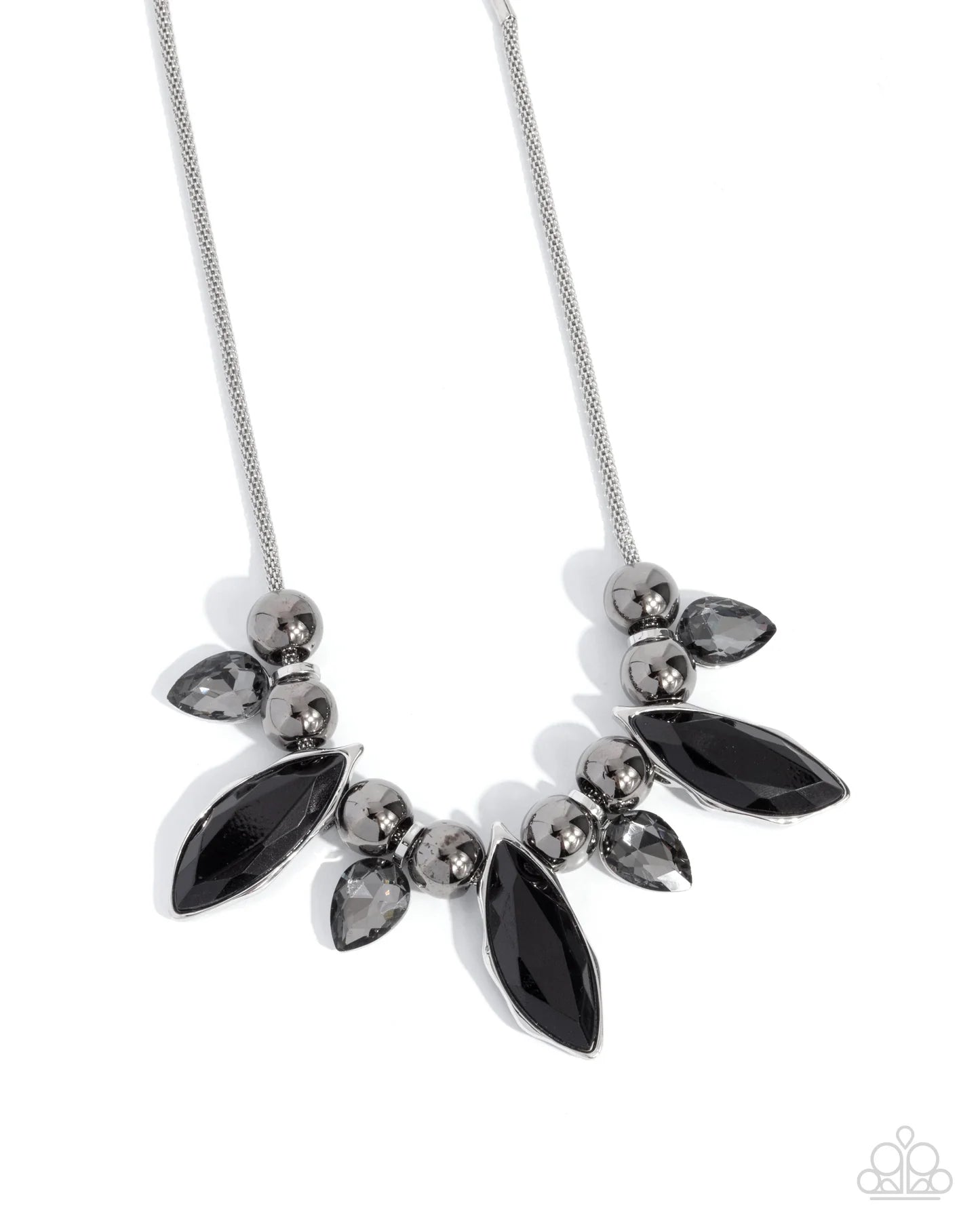 Infused along a silver mesh chain, a collection of oversized glossy gunmetal beads are interrupted by upside-down teardrop smoky gems and oversized chiseled jet-black gems in abstract silver fittings, for a trenchant, edgy display. Features an adjustable clasp closure.