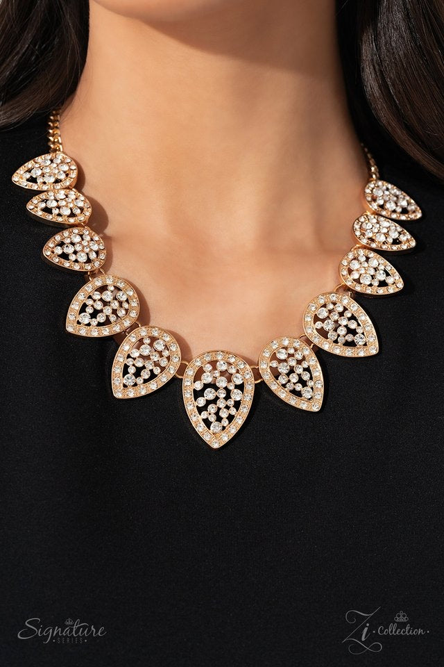 Gold teardrops are dusted in white rhinestones and flipped upside down, fanning out along the collar in a glittery display. Increasing in size as they lead to the center, each teardrop sparkles intensely, showcasing its pristine borders and dramatic dazzle. Features an adjustable clasp closure.